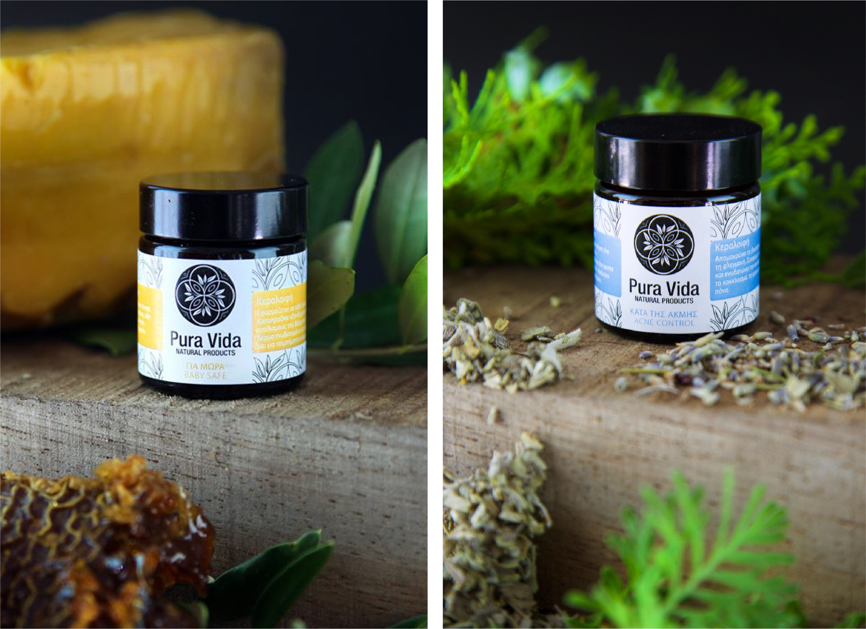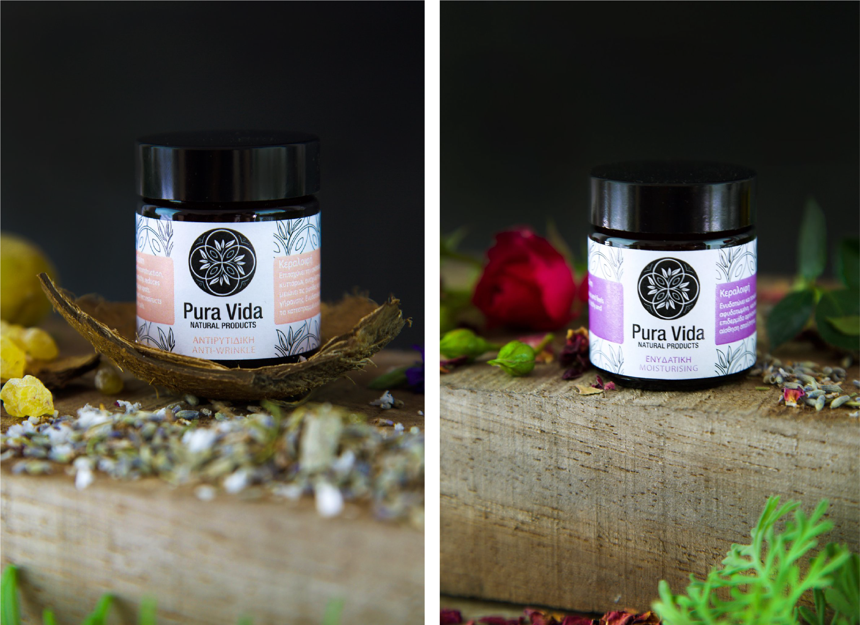 Visual identity design for "Pura Vida" natural cosmetics Pura Vida